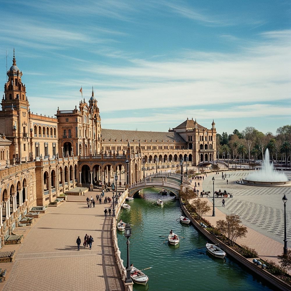 1929년 박람회를 위해 지어진 건축물로, 반원형의 건물과 운하, 타일로 장식된 벤치들이 아름답습니다. 낮에는 관광객, 밤에는 음악 공연으로 활기가 넘칩니다.